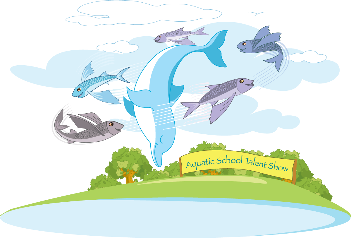 "This is our act for the Talent Show," said Fin. "and in answer to your question — yes our large pectoral fins help us take flight. We can make large leaps in the air — the record time any flying fish has stayed airborne is 45 secs."